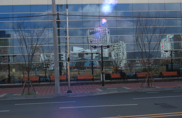 부산 문현동 E마트 외벽이고 유리에 비친 건물은 3만4천평 문현금융단지 벌판 너머에 마구마구 들어서는 원룸 빌딩들입니다.석두는 석실장의 산우회원간에 불리는 呼입니다. 돌대가리 석실장emoticon_016
