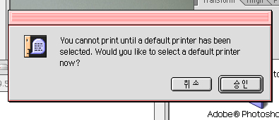 해결방법은 선택에서 왼쪽에 레이져라이터8이나 adobe ps를 클릭후 우측 빈칸을 선택해주고 선택자를 닫으면 프린터가 있는것처럼 프로그램이 인식하기 때문에 말씀하신 경고 문구가 안나옵니다.