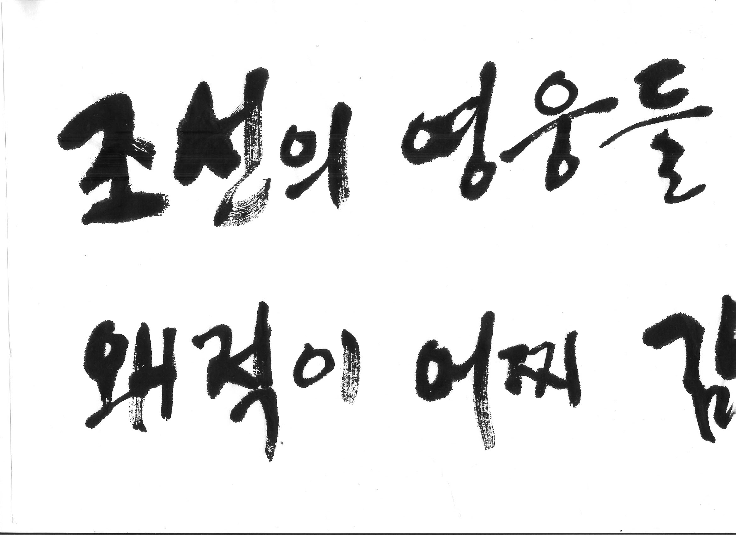 힘찬 캘리 부탁합니다. 김철호 일반 0 13230 2008.09.22 00:49 > > 조선의 영웅들, 천하에 당할 자 없으니 > > > 왜적이 어찌 감히 조선을 넘보리오 > > > > 이렇게 두 문장입니다. > 임진왜란을 주제로 한 캘리인데요. 염치없지만 부탁드려 볼꼐요. >